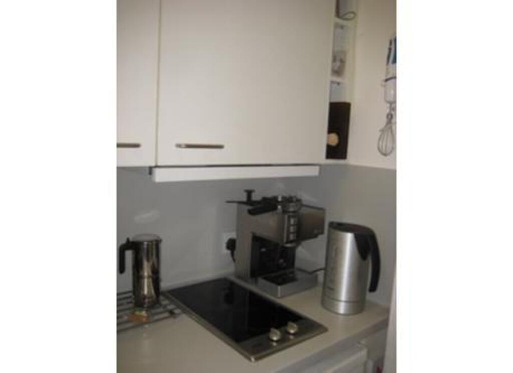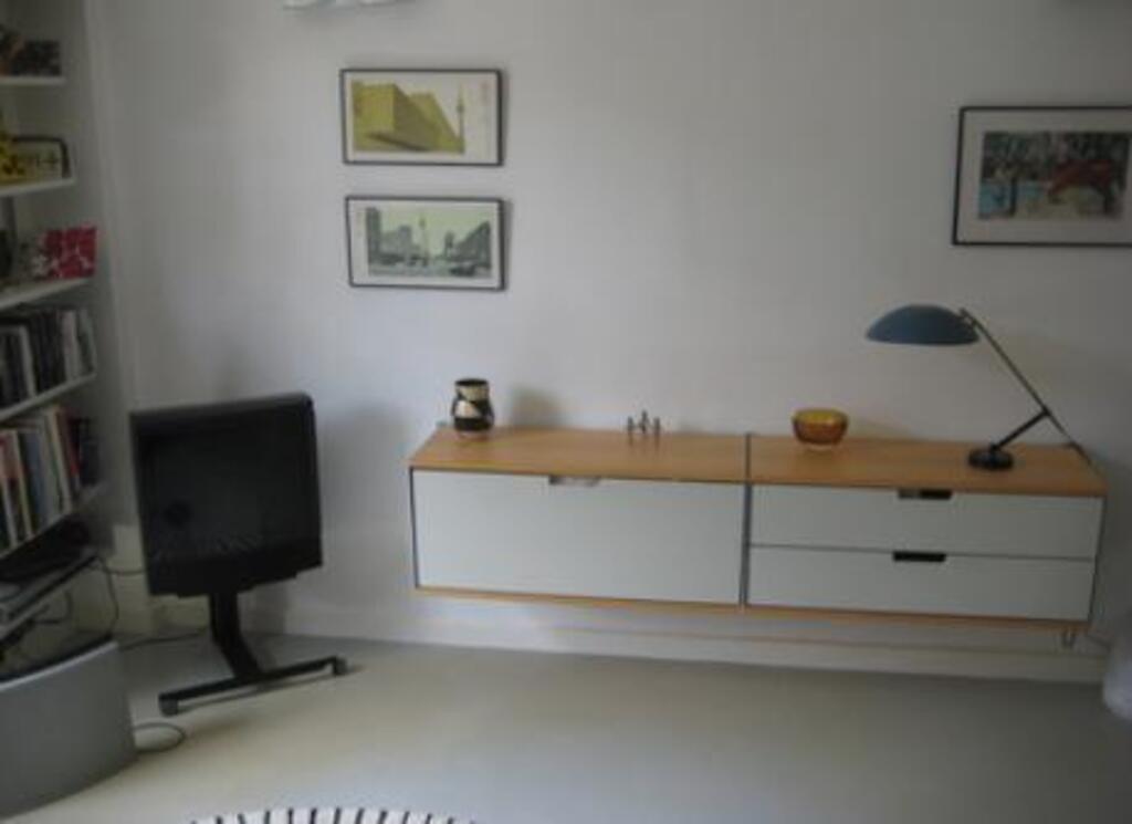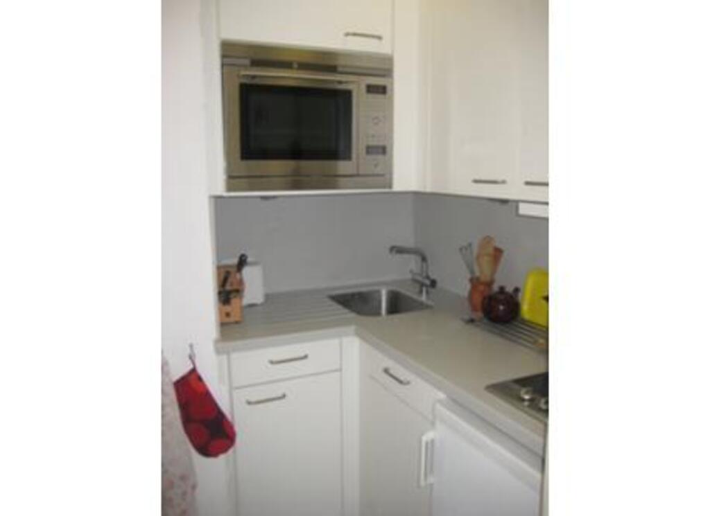 An open topped round London tourist bus stops in the street. The flat is well equipped and has a small kitchen (microwave, oven, dishwasher, electric hob), bathroom and one bed sitting room. There is a sofa bed which sleeps two. There is a television with freeview channels and a DVD player.