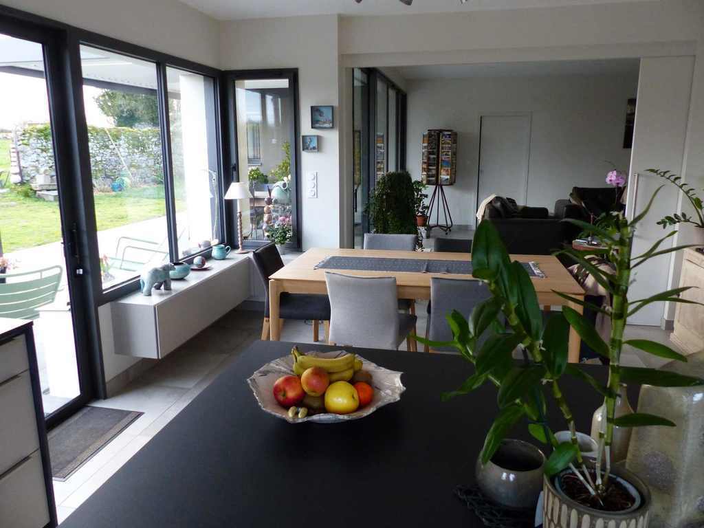 Notre maison neuve comprend une grande pièce de vie de 60 m2 avec une cuisine aménagée, 2 chambres avec 1 salle de bains dans la partie nuit et 1 chambre/bureau avec un canapé convertible neuf avec une salle d'eau attenante. La pièce de vie donne sur une grande terrasse (40 m2)disposant d'une pergola bioclimatique qui peut s'ouvrir ou se fermer en fonction de l'ensoleillement. Notre jardin donne sur un champ ce qui permet de profiter d'un joli paysage. Il n'y a aucun vis à vis sur notre maison, les murs à l'entrée permettre de conserver notre intimité.