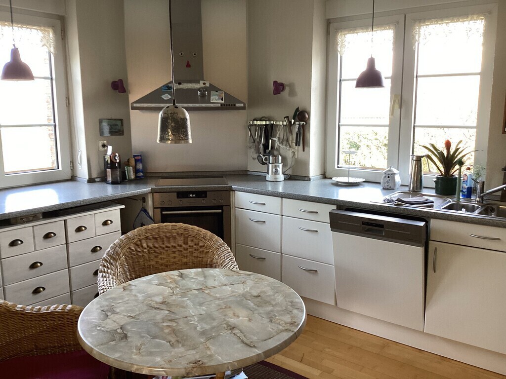 The large kitchen is well equipped for passionate cooks. It has a big round breakfast table and garden windows in two directions.