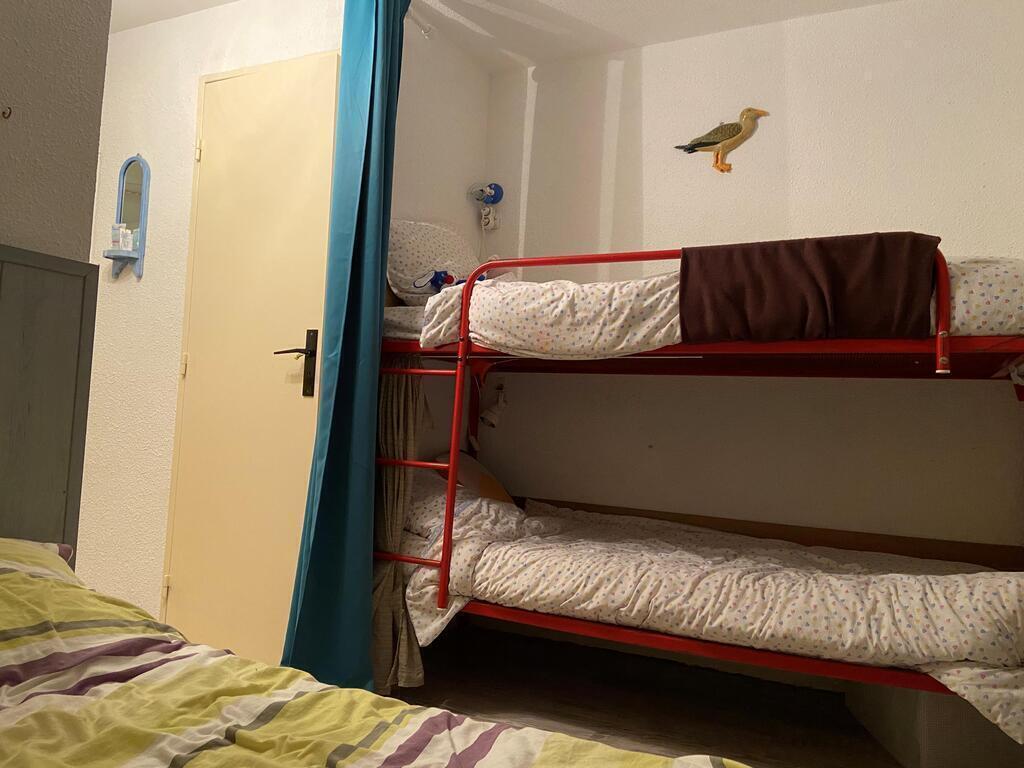 Notre studio double cabine de 23 m² se compose d'un espace nuit avec 2 lits simples superposés (90cmx190cm) et un lit double (140cmx190cm). L'espace nuit est séparé par un rideau et un couloir de l'espace séjour-cuisine. Dans le couloir se trouve une salle d'eau avec un lavabo et une douche. Il y a un wc séparé en face.